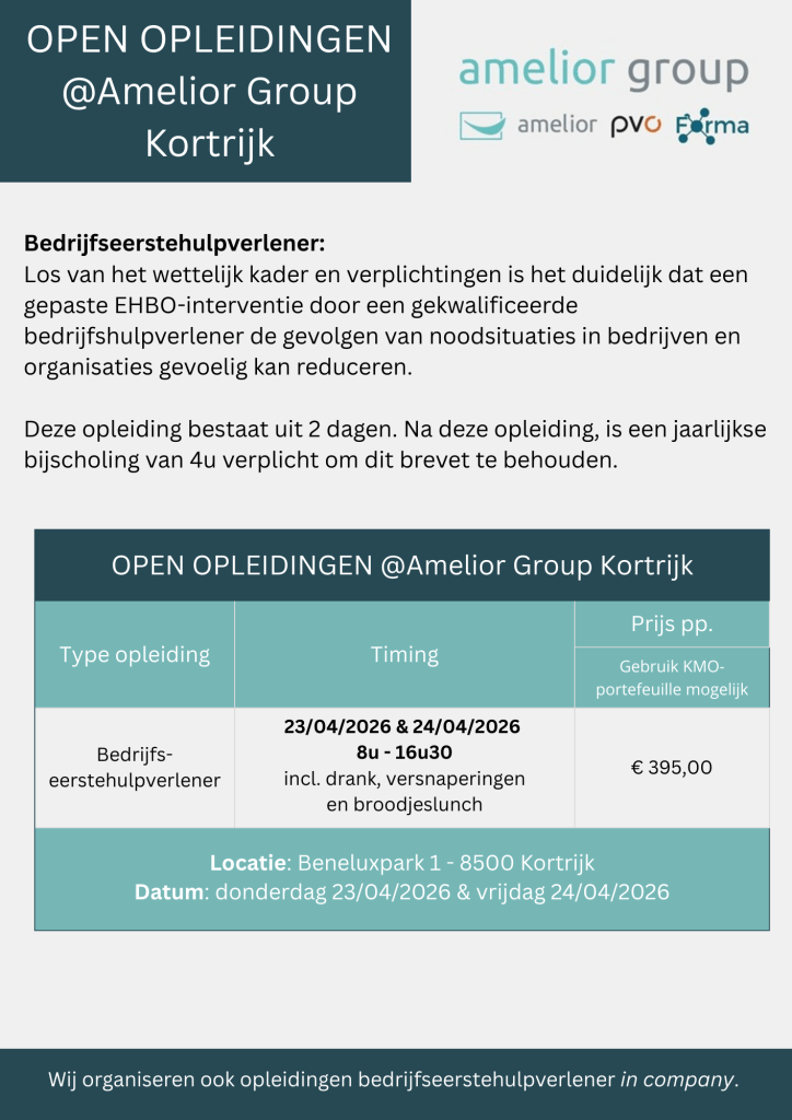 Schakel JavaScript in je browser in om dit formulier in te vullen.Naam + Voornaam * & opleiding 24/04/2026 E-mail *TelefoonnummerOpen opleiding donderdag 23/04/2026 & vrijdag 24/04/2026Bedrijfseerstehulpverlener - 2 dagenIndienen